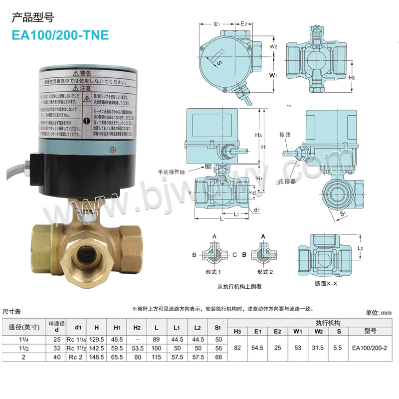 日本KITZ电动三通式球阀EA200-TNE,分为两部分阀体和电动头。